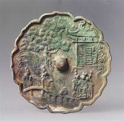 此镜画面中的大树很像《明皇梦游广寒宫》中的“广陵大桂树”;桥面上除了两个人物外,还有一物处于妇人和侍者之前,形似卧坐的金蟾;有着鸱吻、众多圆门钉的宫殿与“广寒清虚之府”的描述也有吻合;盛装妇人与高冠男子想必就是嫦娥和唐明皇了。从人间飞升月宫的唐明皇,跨过小桥来到桂树旁的广寒宫,在宫外等候的嫦娥派侍女前去桥上迎接。不过,月宫镜中的嫦娥多是年轻女子的形象,此镜中的嫦娥却似一贵妇,所以有说法认为此类铜镜的画面表现的是周穆王见西王母的场景,倒也有些许道理。
