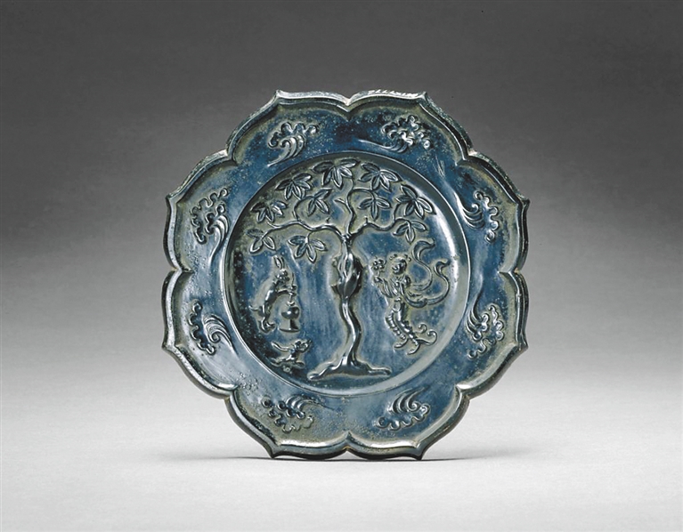 宋代还流行一种唐明皇游月宫纹饰的铜镜,唐明皇即唐玄宗李隆基。唐皇游月宫是古代的民间传说故事,不少传奇小说、元杂剧的创作都曾取材于这个故事。比如小说集《龙城录》中就有一则故事叫《明皇梦游广寒宫》:话说开元年间,唐明皇与申天师、道士鸿都客在宫中同游,申天师施法让三人飞上云端游月,看到一处匾为“广寒清虚之府”的宫府。申天师将唐明皇引至高处,明皇“但闻清香霭郁,下若万里琉璃之田……素娥十余人,皆皓衣乘白鸾,往来笑舞于广陵大桂树之下,又听乐音嘈杂亦甚清丽”。
