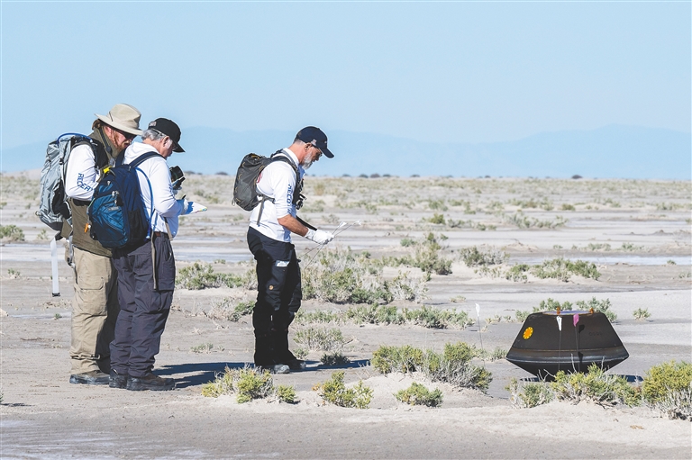 这张由美国航天局发布的照片显示,9月24日,在美国犹他州盐湖城附近,科研人员在查看小行星采样探测器奥西里斯-REx的样本舱。