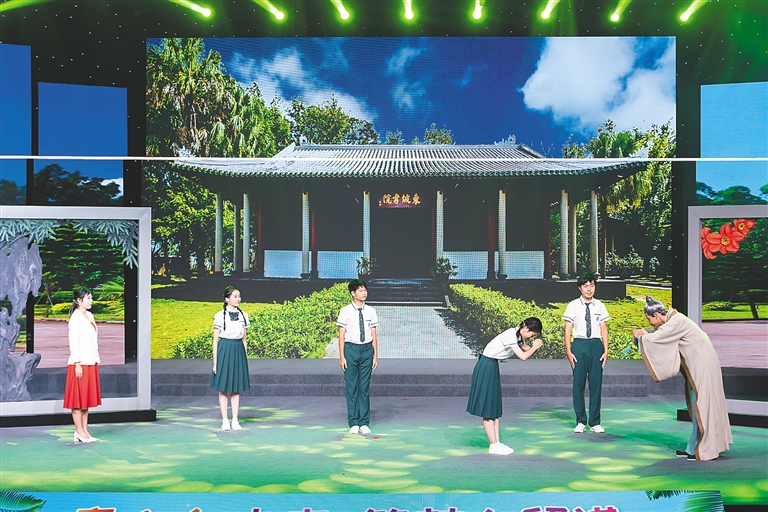 近日,在海南中学一间教室里,该校戏剧社的师生们正在排练原创情景剧《追寻》。该剧的灵感来自海南中学每年组织学生参与的社会实践和研学实践活动,以追寻中国精神为主题。从玉包港登陆作战纪念碑、东坡书院到洋浦港,师生们通过舞蹈、朗诵、说唱等表演形式,追寻红色记忆、传承革命精神,穿越千年聆听东坡先生的海岛故事,感受海南自贸港建设的日新月异。