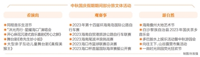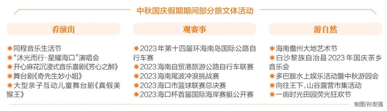 中秋国庆期间,同程音乐生活节、“沐光而行·星耀海口”演唱会、2023“回忆经典 唱响三亚”群星璀璨演唱会、白沙黎族自治县2023年国庆茶乡音乐会等多场音乐盛宴,将在海口、三亚、白沙等地轮番上演。同时,开心麻花沉浸式音乐喜剧《芳心之醉》、舞台剧《奇先生妙小姐》、大型亲子互动儿童舞台剧《真假美猴王》等文艺演出也将在海口、东方等地登台,满足市民游客的精神文化需求。