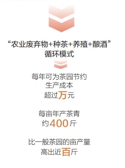 这份甜头的背后,是一套生态立体循环农业模式的有效输出——农业废弃物+种茶+养殖+酿酒,王启望摸索出的这一模式,保护生态环境的同时,还能提升茶叶品质和产量。