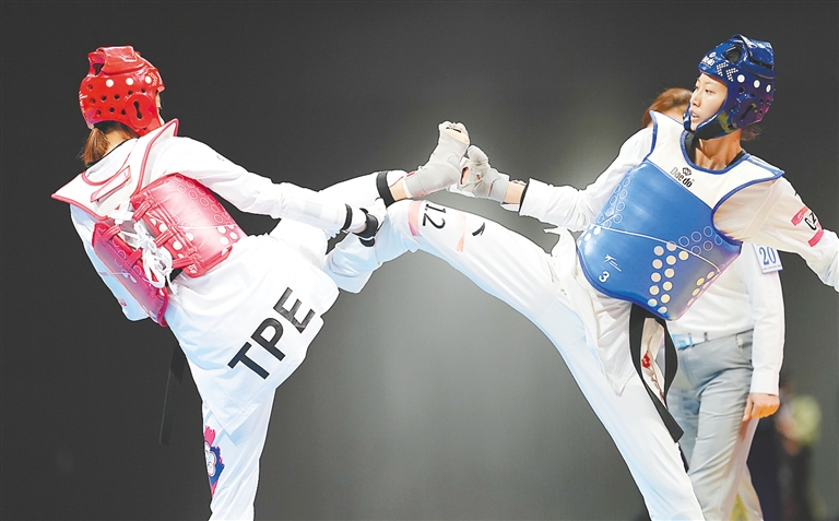 9月26日,在杭州亚运会跆拳道女子57公斤级决赛中,中国选手骆宗诗战胜中国台北选手罗嘉翎,获得冠军。图为骆宗诗(右)与罗嘉翎在比赛中。新华社记者 江文耀 摄