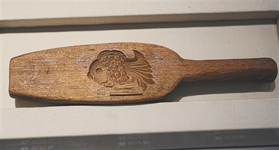 在海南省博物馆“仙凡之间”海南风情陈列展厅,摆放着三个民国时期的琼式月饼模具。琼式月饼比较精致小巧,模具体积也相应较小。这三个木质模具上,雕刻着精致清晰的图案,其中有两个圆形的模具上分别刻着“莲蓉”和“蛋黄莲蓉”,还有一个双面月饼模具,一面是寓意年年有余的鱼造型,另一面则是代表健康长寿的寿桃造型。