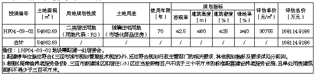 一、挂牌出让宗地基本情况和开发建设要求:(一)挂牌出让宗地基本情况:本次挂牌出让宗地位于中心城区控规HP04-03-02地块,面积54662.63平方米,用地四至及界址坐标详见地块勘测定界图。经核查2022年10月14日经自然资源部批复的《三亚市国土空间总体规划(2021—2035)》“三区三线”划定成果,该地块位于城镇开发边界(城镇集中建设区)内,不涉及占用永久基本农田和生态保护红线。同时,经核查《三亚市中心城区控制性详细规划(修编及整合)》,该宗地用地规划性质为二类居住用地(用地代码:R2),对应土地用途为城镇住宅用地(市场化商品住房)。