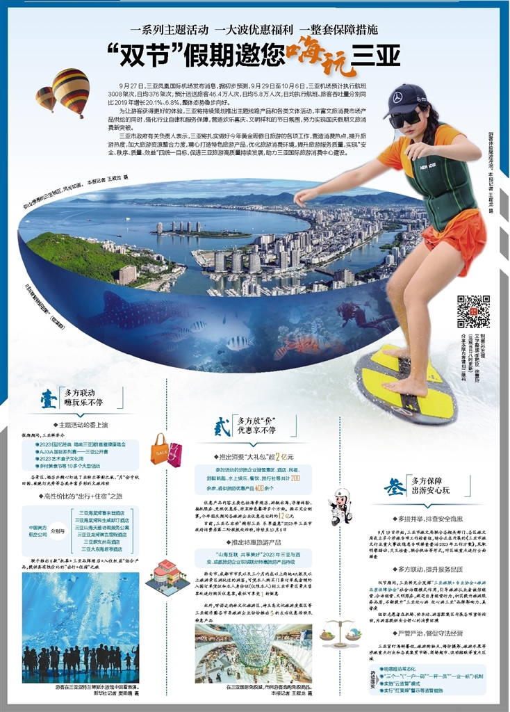 为让游客获得更好的体验,三亚将持续策划推出主题线路产品和各类文体活动,丰富文旅消费市场产品供给的同时,强化行业自律和服务保障,营造欢乐喜庆、文明祥和的节日氛围,努力实现国庆假期文旅消费新突破。