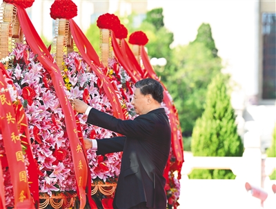 习近平迈步上前,仔细整理花篮缎带。随后,习近平等党和国家领导人缓步绕行,瞻仰人民英雄纪念碑。