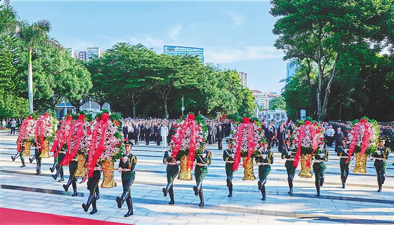 深情的《献花曲》响起,18名礼兵稳稳抬起9个花篮,缓步向前,拾级而上,将花篮摆放在纪念碑前。这9个花篮,分别由省委,省人大常委会,省政府,省政协,省军区,各民主党派、工商联和无党派人士,各人民团体,各界群众,少年先锋队敬献。花篮的红色缎带上写着“烈士永垂不朽”,寄托着1000多万海南人民对英烈的无限哀思和崇高敬意。