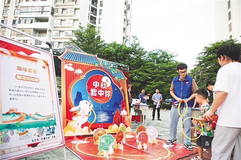 在三角公园活动现场,投壶、猜灯谜、月饼发放以及义剪服务、文艺表演等环节,吸引不少市民游客关注。市民符柳春一边品尝月饼,一边参与小游戏,获得了精美小礼品,“活动接地气,服务很贴心。”