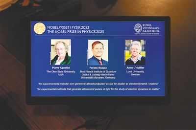 据新华社斯德哥尔摩10月3日电 (记者和苗 付一鸣)瑞典皇家科学院3日宣布,将2023年诺贝尔物理学奖授予皮埃尔·阿戈斯蒂尼、费伦茨·克劳斯和安妮·吕利耶,以表彰他们将产生阿秒光脉冲的实验方法用于研究物质的电子动力学。