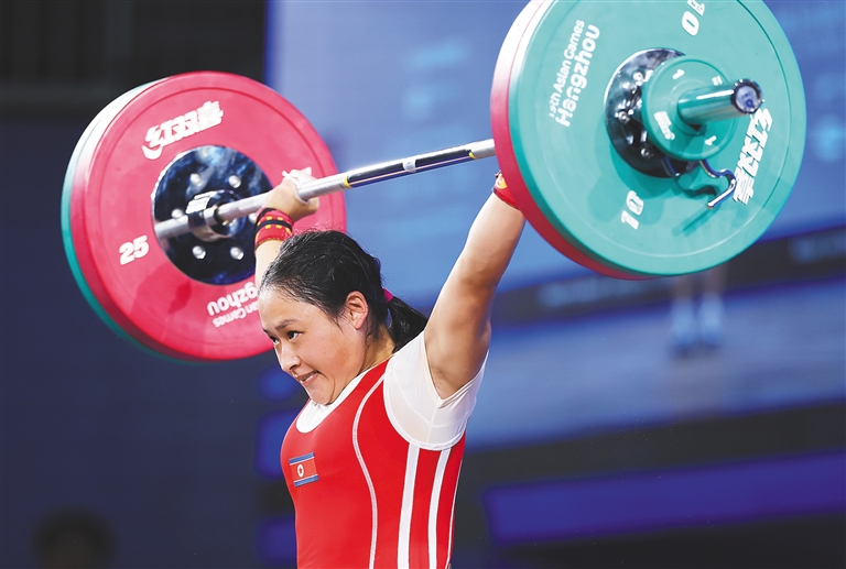 9月30日,在本届亚运会首个举重比赛日,朝鲜队在女子49公斤级和女子55公斤级的比赛中获得2金1银,除49公斤级的抓举成绩外,其余5项成绩均打破世界纪录。10月2日,举重项目进入第三个比赛日,朝鲜女子举重选手再为朝鲜代表团夺得两枚金牌,并打破女子59公斤级抓举世界纪录。