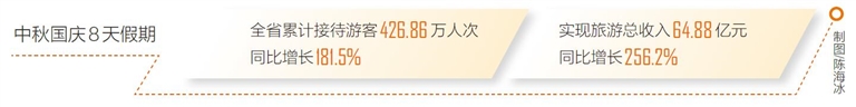 总的来看,今年中秋国庆假日,我省旅游文化市场整体呈现出以下特点:全域旅游格局初步形成,产品供给更加丰富多元,旅游舒适度提升,观光与度假并重,度假比例进一步加大,全省各地亮点频出,旅游市场平稳有序。