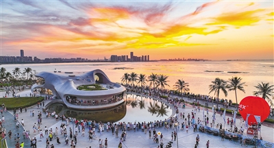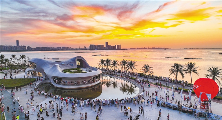 海口湾畔的云洞图书馆是海口一处网红打卡地,10月4日傍晚时分,夕阳美景让市民游客纷纷拍照留念。本报记者 陈元才 摄