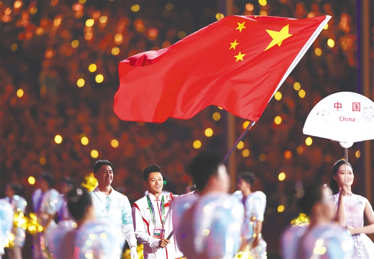 中国体育代表团旗手谢震业在闭幕式上入场。