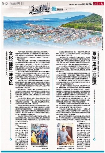 有时,郭玉光摇身一变为讲解员,将熟悉的故事娓娓道来:海南疍家人散居在沿海各市县,陵水和三亚是其中主要的两个聚集地,人数已经超过1.5万人;长久的生产生活中,疍家人逐渐形成了自己独特的海上族落,衣帽、居屋、饮食、民歌、婚嫁等民俗文化极具特色;气鼓鱼粥是新村渔排上最经典的海鲜佳肴之一,浓郁鲜香,鱼肉嫩滑……