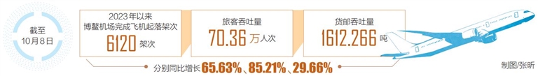今年中秋、国庆双节假期期间,博鳌机场也迎来了客流小高峰,完成飞机起落架次142架次,旅客吞吐量1.69万人次,货邮吞吐量23.86吨,分别同比增长222.73%、303.89%、295.38%。