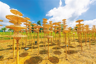 日头正盛,300余个竹编簸箕层层叠叠搭在一起,竟如烈日下的海浪般金光灿灿。政府引领,企业带动,儋州市乡村振兴的浪潮正在不断翻涌,焕发着新的生机。