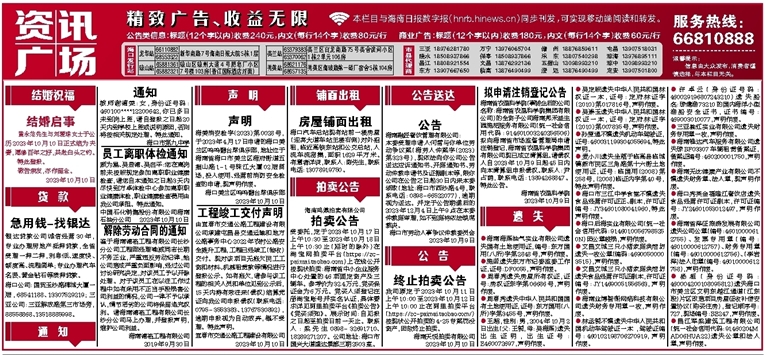 受委托,定于2023年10月17日上午10:30至2023年10月18日上午10:30止(延时的除外)在淘宝网拍卖平台(https://zc-paimai.taobao.com)上在线公开按现状拍卖:海南省中小企业服务中心处置的46项固定资产及三辆车。参考价为32.4万元,竞买保证金为6万元。竞买人须登记注册淘宝账号并实名认证,具体要求详见阿里拍卖平台《拍卖公告》《竞买须知》。展示时间:自见报之日起至拍卖日前一天止。联系人:梁先生0898-32691710、18289271207。公司地址:海口市国兴大道盛达景都三期2503室。