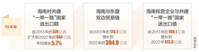 本报海口10月10日讯(记者曹马志 通讯员詹晨)今年是共建“一带一路”倡议提出十周年,同频共振的海南外贸事业交出了一份亮丽答卷。10月10日,海南日报记者从海口海关获悉,共建“一带一路”倡议提出以来,海南对共建“一带一路”国家(以下简称共建国家)进出口规模稳步扩大,进出口额由2013年的574亿元扩大到2022年的944亿元,年均增长5.7%。