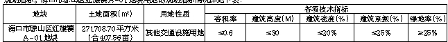 经海口市人民政府批准,海口市自然资源和规划局决定以挂牌方式出让一幅海口市琼山区红旗镇A-01地块的国有建设用地使用权。现将有关事项公告如下:一、出让宗地的基本情况和规划指标要求:(一)基本情况及宗地净地情况。本次挂牌出让的地块位于海口市琼山区红旗镇A-01地块,面积为271708.70平方米(合407.56亩),土地用途为其他交通设施用地,土地出让年限为50年。目前地块安置补偿落实到位、地上附着物已清表、土地权利清晰、无法律经济纠纷、土地开发利用规划条件明确、土壤无污染,具备动工开发所必需的条件。(二)主要规划指标。海口市琼山区红旗镇A-01地块用地的规划指标情况详见下表: