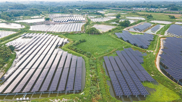近日,航拍位于琼海市塔洋镇峪山村的“渔光互补”项目。这处利用塔洋镇万亩罗非鱼基地鱼塘上方空间实施的项目,计划建设1800亩光伏电板,建成后项目年均发电量约1.3亿千瓦时。文/本报记者 陈子仪 图/特约记者 蒙钟德