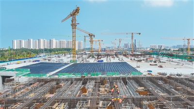 近日,在海口新海港和南港“二线口岸”(货运)集中查验场所建设项目施工现场,机械轰鸣,工人忙碌施工,为项目节点目标奋力冲刺。