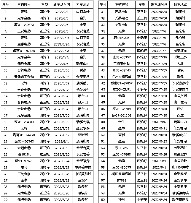 我县打砂组于2023年4月1日至2023年9月30日期间在辖区内查获涉嫌非法采盗河砂的车辆及机具。因车辆和机具的所有权人不明,从本公告发布之日起一年内,请公告清单列表上的所有车辆和机具的所有权人携带个人身份证及其他证明车辆、机具来源材料到澄迈县综合行政执法局1楼县“多规合一”管控行政执法大队办理相关手续。逾期未认领的,我局将依法移送相关部门进行无主物的财产处置。办公室电话:0898-67615217,地址:海南省澄迈县金江镇金马大道党校一楼。