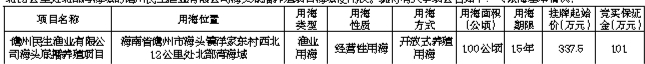 二、竞买事项:(一)中华人民共和国境内的法人、自然人或其他组织满足以下条件的均可报名参加竞买(除法律、法规另有规定的除外),申请参加竞买者须提出书面竞买申请,并按照要求提供相关材料。(二)提供时点在公告期间不低于人民币337.5万元的银行资信证明,并缴纳竞买保证金人民币101万元。保证金账户名称:儋州市公共资源交易服务中心;开户行:建设银行儋州支行营业部;账号:46050100623600000184。(三)本次挂牌出让设有底价,按照价高且不低于底价者得的原则确定竞得人。(四)申请人可于2023年10月13日至2023年11月10日到海口市龙华区国贸路13号森堡大厦八楼咨询和购取挂牌出让手册,并按挂牌出让手册的具体要求报名参加竞买。(五)交纳竞买保证金的截止时间为2023年11月 10日17:00(北京时间)。经审核,申请人按规定交纳竞买保证金(以竞买保证金入账户时间为准),具备申请条件的,我局将在2023 年11月10日17:30(北京时间)前确认其竞买资格。(六)挂牌时间:2023年11月2日8:30至2023年11月13日10:00 (北京时间)。(七)挂牌现场会时间:2023年11月13日10:00。(八)挂牌地点:儋州市公共资源交易服务中心开标室1(海南省儋州市那大镇怡心花园D15号)。(九)组织交易:根据受让方征集情况,确定交易方式,若只征集到一名意向受让方,采取挂牌方式交易;若征集到两名及以上意向受让方,采取拍卖竞价方式交易。三、其他事项:(一)本次竞买活动挂牌报价阶段只接受书面报价,不接受电话、邮寄、电子、口头等其他方式报价。(二)本次挂牌出让事项如有变更,以届时变更公告为准。(三)本公告未尽事宜详见本次海域使用权挂牌出让手册,该手册所载内容为本公告的组成部分。(四)联系方式: 0898-66531951 13876269988。(五)查询网址:https://zw.hainan.gov.cn/ggzy/dzggzy/。