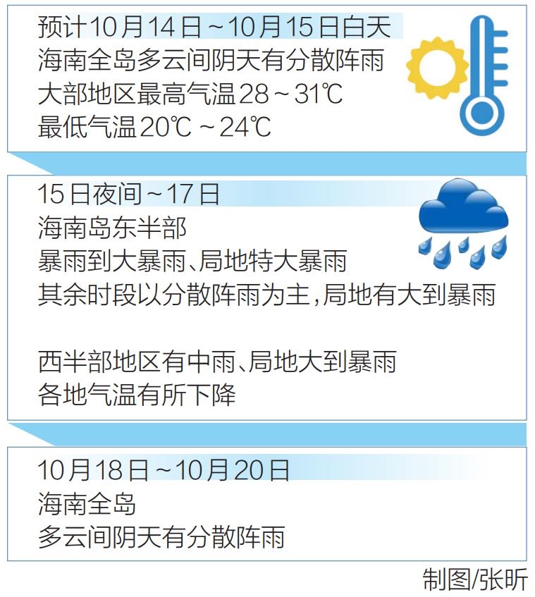 本报海口10月13日讯 (记者张期望 通讯员符晓虹 翁小芳)10月13日,记者从海南省气象台了解到,预计10月15日夜间~10月17日,海南岛东半部地区将有一次强降水过程,请相关部门做好防范。