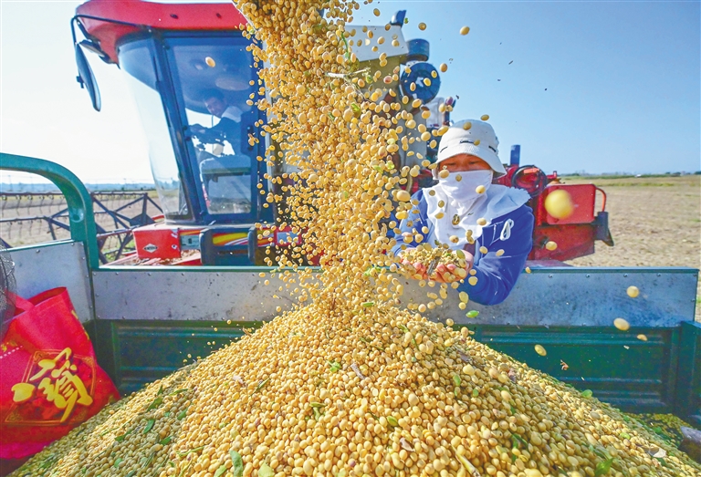 10月14日,在河南省洛阳市孟津区会盟镇黄河岸边的下古村,农民收获大豆。