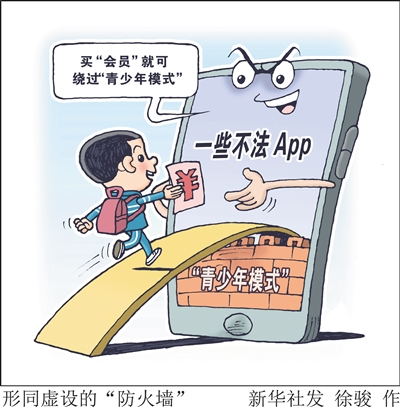 新华社天津10月14日电 (记者白佳丽)“青少年模式”既是网络风险的“防火墙”,也对未成年人上网时段、时长、浏览内容等作出限制。但是一些不法App却做起了开启“会员尊享特权”,就能绕过“青少年模式”的生意,试图让“防沉迷”系统形同虚设并借此牟利。