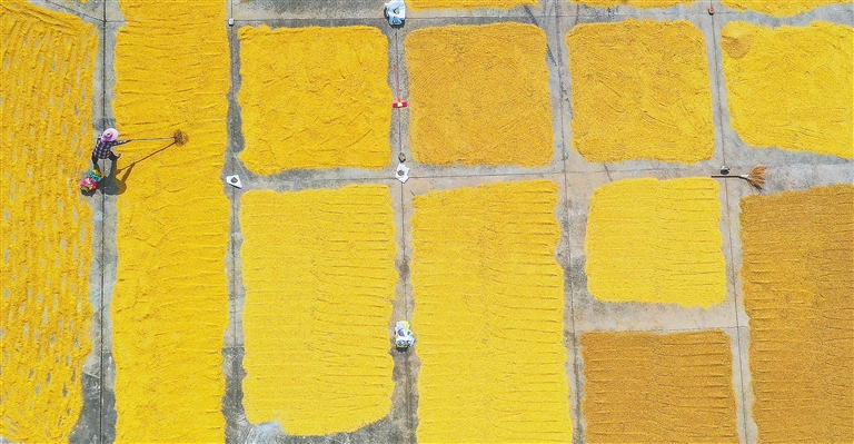 定安县定城镇居民在谷场晒丰收的稻谷。本报记者 张茂 通讯员 程守满 图/文