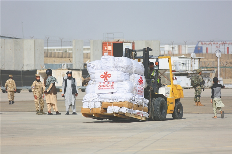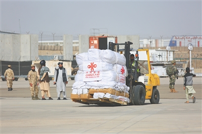 图为10月15日,中国政府援助阿富汗第一批抗震救灾物资运抵阿西北部赫拉特省赫拉特市。新华社发