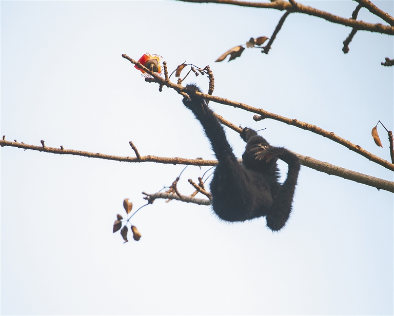 “有时太贪吃,也吃出了窘状。”李文永打趣地介绍,今年8月份,他在近距离监测到C群时注意到,其中一只5岁的黑猿嘴巴红肿得几乎都歪了,推测为掏食蜂蛹时被蜇伤了,好在2天后再次监测到它时,红肿已基本消退。而早在2021年时,另一监测队员李全金也曾看到,其中一只幼猿的右眼疑似被毒蜂蜇咬得红肿,但没隔多久又自动痊愈了。