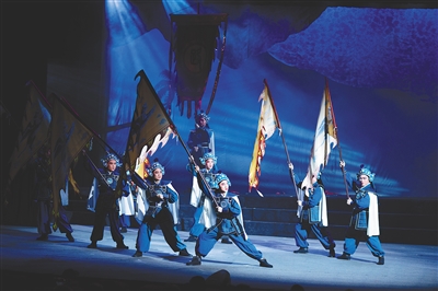 开场时,在古朴的乐曲中,短短二十几秒,台上就用形体剪影的变幻,演绎了叛贼烧杀掠抢、欺压俚人的场景……随即画面急转——平乱的圣旨传来,路博德领旨挥师南下。