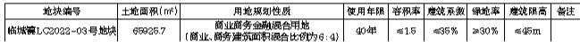 一、挂牌出让宗地的基本情况和规划指标要求:(一)挂牌出让宗地的基本情况:地块的位置及面积:临高县临城镇金澜大道与滨海大道交汇处西北侧,出让地块面积65925.7平方米(合98.89亩),规划用途为商业商务金融混合用地(商业、商务建筑面积混合比例为6:4),土地用途为商业商务金融混合用地(商业、商务建筑面积混合比例为6:4),土地使用年限40年,挂牌出让地块的四至范围详见《临城镇LC2022-03号地块勘测定界图》所示。地块农用地转用及土地征收手续于2022年经海南省人民政府《关于临高县临城镇LC2022-01号地块农用地转用和土地征收方案的批复》[琼府委托资规(临高)〔2022〕8号]批准。出让地块土地利用条件详见下表: