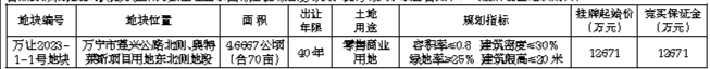 二、竞买人资格及竞买要求:(一)竞买人资格:本次挂牌活动凡属中华人民共和国境内外的法人、自然人和其他组织(除法律另有规定者外)均可申请参加挂牌。属境外机构和个人(含港、澳、台地区)申请参与竞买的,按照规定需提交商务主管部门核发的《外商投资企业批准证书》和市场监督管理部门核发的《营业执照》。本次挂牌不接受联合竞买。失信被执行人不得参加本次项目竞买。(二)竞买人要求:(1)凡在万宁市境内已取得建设用地使用权且造成土地闲置的,或者拖欠土地出让金未缴的,均不具备竞买人条件。(2)竞买人需在签订《成交确认书》后与万宁市商务局签订《海南省产业项目发展和用地准入协议》,并严格按照《海南省产业项目发展和用地准入协议》约定内容进行开发建设,否则将承担相关违约责任。三、本次国有建设用地使用权挂牌出让设有底价,按照出价最高且不低于底价的原则确定竞得人。四、竞买咨询及报名期限:本次挂牌出让的详细信息和具体要求,见挂牌出让手册及其他相关文件。手册和文件可从海南省建设用地使用权和矿业权网上交易系统(以下简称网上交易系统,网址:http://lr.hainan.gov.cn:9002)查看和打印。竞买人持CA数字证书实名登录网上交易系统进行相关操作,系统注册及证书办理详见《海南省建设用地使用权和矿业权网上交易系统用户手册》。挂牌出让文件所载内容亦为本公告的组成部分。本次国有建设用地使用权实行网上挂牌出让,有意向的竞买人可登录网上交易系统提交竞买申请,按要求上传竞买申请文件。竞买保证金缴纳截止时间:2023年10月17日17:00 (以银行系统记录到账时间为准)。竞买申请时间:2023年10月17日08:30 至 2023年11月13日17:00(以网上交易系统服务器时间为准,下同)。五、资格确认:经审查,申请人按规定交纳竞买保证金,具备申请条件的,我局将在2023年11月13日17:30前确认其竞买资格,网上交易系统自动发放《竞买资格确认书》。六、挂牌报价时间及地点:网上挂牌时间:起始时间2023年11月6日08:30;截止时间2023年11月16日10:00。网上挂牌地点:海南省建设用地使用权和矿业权网上交易系统(网址:http://lr.hainan.gov.cn:9002)。 网上挂牌报价时间截止时,无竞买人报价,挂牌活动自动结束;有竞买人报价,网上交易系统限时5分钟在线询问,有竞买人在此规定时限内表示愿意参与网上限时竞价的,系统自动进入网上限时竞价程序,以竞价方式确定竞得人。七、开发建设要求:(一)该地块已经达到下列净地条件:安置补偿落实到位,土地权利清晰;不存在土壤污染,符合土壤环境质量要求;确认通水、通电、通路等,完成土地平整,具备动工开发必需的条件;已完成地上附着物清表,地上附着物已补偿到位,无法律经济纠纷。(二)土地出让控制指标:零售商业产业投资强度指标应为≥300万元/亩,年度产值指标应为≥450万元/亩,年度税收指标应为≥12万元/亩。该控制指标参照《海南省自然资源和规划厅 海南省发展和改革委员会 海南省农业农村厅 海南省工业和信息化厅 海南省商务厅 海南省财政厅 国家税务总局海南省税务局关于印发〈海南省产业用地控制指标〉的通知》(琼自然资用〔2023〕12号)文件确定。项目达产时间为签订《国有建设用地使用权出让合同》后的3年内。以上出让指标列入《海南省产业项目发展和用地准入协议》,属该协议内容的组成部分。(三)经查询全国污染地块土壤环境管理系统,该地块不在系统污染或疑似污染地块范围内。用地如涉及压覆重要矿产及位于地质灾害易发区,在该地块内进行项目建设依法需办理建设项目压覆矿产资源审批手续及地质灾害危险性评估的,应按规定办理相关手续。(四)该宗地须按照我省商业、办公类建设项目管理要求进行开发建设,不得兴建“类住宅”项目,不得采用住宅套型设计,套内建筑不得设置独立厨房、卫生间、排水排烟等设施,具体按照《海南省自然资源和规划厅 海南省住房和城乡建设厅 海南省市场监督管理局关于加强商业、办公类建设项目全过程管理的意见》(琼自然资规〔2021〕12号)执行。(五)装配式建造方式应按照《海南省住房和城乡建设厅 海南省发展和改革委员会 海南省自然资源和规划厅 海南省市场监督管理局 海南省工业和信息化厅关于进一步稳步推进装配式建筑有关事项的通知》(琼建科函〔2021〕155号)等文件要求执行。八、其他需要公告的事项:(一)本次挂牌出让活动采取线上进行,不接受电话、信函、邮寄、电子邮件及口头竞买申请。(二)按照《海南省自然资源和规划厅关于海南省土地交易市场竞买保证金可使用银行保函的通知》(琼自然资规〔2022〕7 号)要求,竞买人可使用银行保函方式缴纳竞买保证金,保函应为不可撤销、见索即付保函,保函担保金额应不少于全额土地竞买保证金,保函的保证期限应当自保函开立之日起至招标拍卖挂牌交易活动结束后不少于60日,保函需在保证金交纳截止时间前2个工作日内送达我局。(三)受理时间:08:30至12:00,14:00至17:30(节假日除外)。(四)本次挂牌出让事项如有变更,届时以变更公告为准。九、咨询方式:联系地址:万宁市万城镇望海大道南侧万宁市自然资源和规划局。咨询电话:0898-62217899;联 系 人:梁先生;查询网址:http://zw.hainan.gov.cn/ggzy/;http://lr.hainan.gov.cn;http://www.landchina.com。