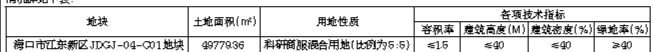 一、出让宗地的基本情况和规划指标要求:(一)基本情况及宗地净地情况。本次挂牌出让的宗地位于海口市江东新区JDGJ-04-C01地块,土地面积为49779.36平方米(74.67亩),土地用途为科研和其他商业服务业用地(科研用地占50%,其他商业服务业用地占50%),土地出让年限为科研用地50年,其他商业服务业用地40年。目前地块安置补偿落实到位、地上附着物已清表、土地权利清晰、无法律经济纠纷、土地开发利用规划条件明确、土壤无污染,具备动工开发所必需的条件。(二)主要规划指标。海口市江东新区JDGJ-04-C01地块用地的规划指标情况详见下表: