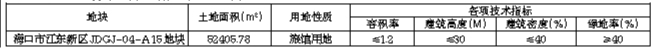 一、出让宗地的基本情况和规划指标要求:(一)基本情况及宗地净地情况。本次挂牌出让的地块位于海口市江东新区JDGJ-04-A15地块,面积为52405.78平方米(78.61亩),土地用途为旅馆用地,土地出让年限为40年。目前地块安置补偿落实到位、地上附着物已清表、土地权利清晰、无法律经济纠纷、土地开发利用规划条件明确、土壤无污染,具备动工开发所必需的条件。(二)主要规划指标。海口市江东新区JDGJ-04-A15地块用地的规划指标情况详见下表: