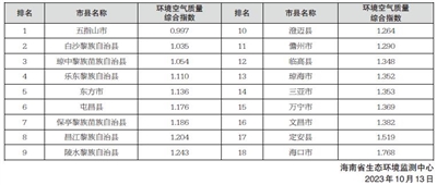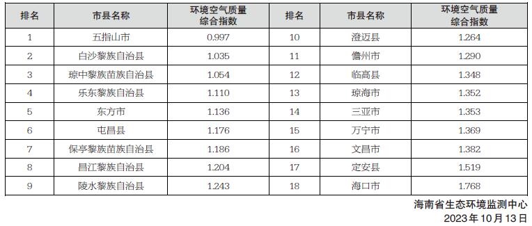 环境空气质量排名靠前的市县分别是五指山市、白沙黎族自治县和琼中黎族苗族自治县,排名靠后的市县分别是海口市、定安县和文昌市。2023年9月全省18个市县环境空气质量排名如右:
