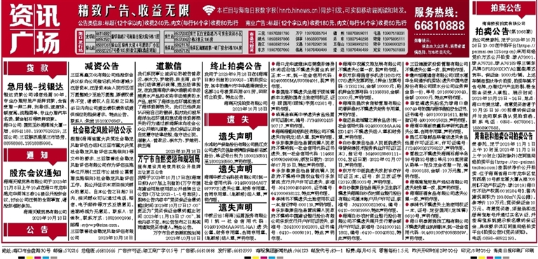 受委托,定于2023年11月1日上午10时至2023年11月2日上午10时止(延时除外)在阿里网络拍卖平台(https://zc-paimai.taobao.com)按现状净价公开拍卖:位于海南省海口市龙华区世贸西路10号新宏基大厦A座705房【不动产权证为:琼〔2019〕海口市不动产权第0016284号】;套内建筑面积为133.86m2(无公摊)。参考价110万元;竞买保证金10万元。有意竞买者,须登录和注册淘宝账号并通过实名认证,并按淘宝系统提示报名缴纳保证金,具体要求详见阿里网络拍卖平台《拍卖公告》《竞买须知》。电话:0898-68522193。