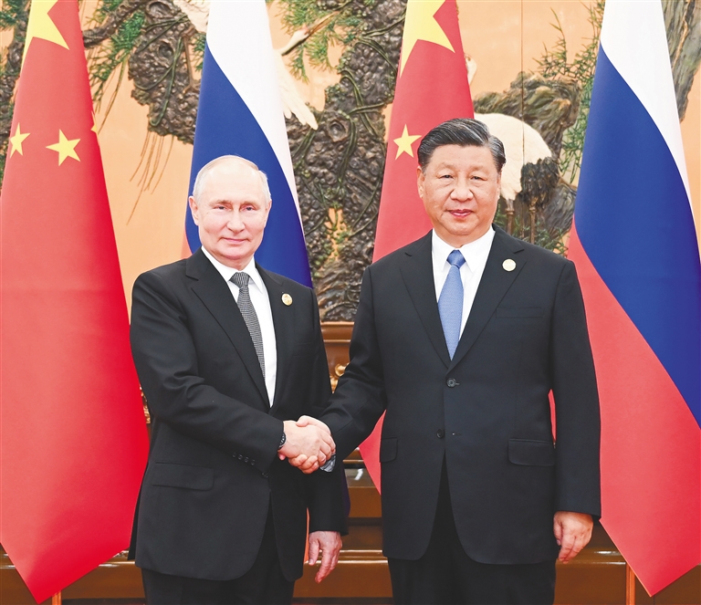 习近平指出,普京总统连续3次出席“一带一路”国际合作高峰论坛,体现了俄方对共建“一带一路”倡议的支持。俄罗斯是中国开展共建“一带一路”国际合作的重要伙伴。中俄东线天然气管道等重大基础设施项目投入运营,为两国人民带来了实打实的好处。中方愿同俄方及欧亚经济联盟各国一道,推动共建“一带一路”与欧亚经济联盟对接,开展更高水平、更深层次的区域合作,希望中蒙俄天然气管道项目尽早取得实质性进展,开展好“万里茶道”跨境旅游合作,把中蒙俄经济走廊打造成一条高质量联通发展之路。