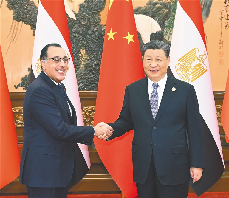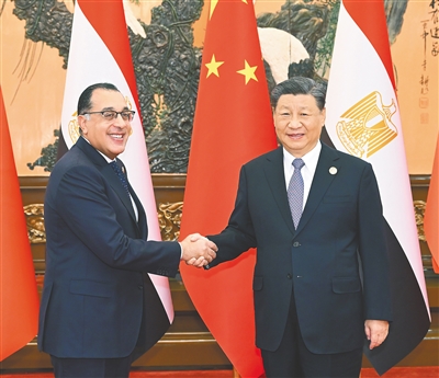 | 10月19日上午,国家主席习近平在北京人民大会堂会见来华出席第三届“一带一路”国际合作高峰论坛的埃及总理马德布利。