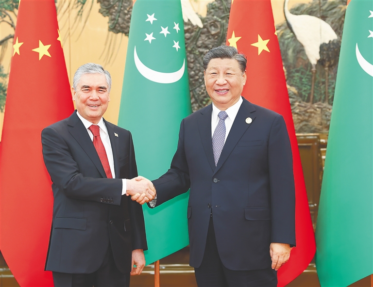 | 10月19日上午,国家主席习近平在北京人民大会堂会见来华出席第三届“一带一路”国际合作高峰论坛的土库曼斯坦民族领袖、人民委员会主席别尔德穆哈梅多夫。新华社记者 黄敬文 摄 |