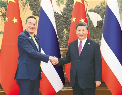 | 10月19日下午,国家主席习近平在北京人民大会堂会见来华出席第三届“一带一路”国际合作高峰论坛并进行正式访问的泰国总理赛塔。