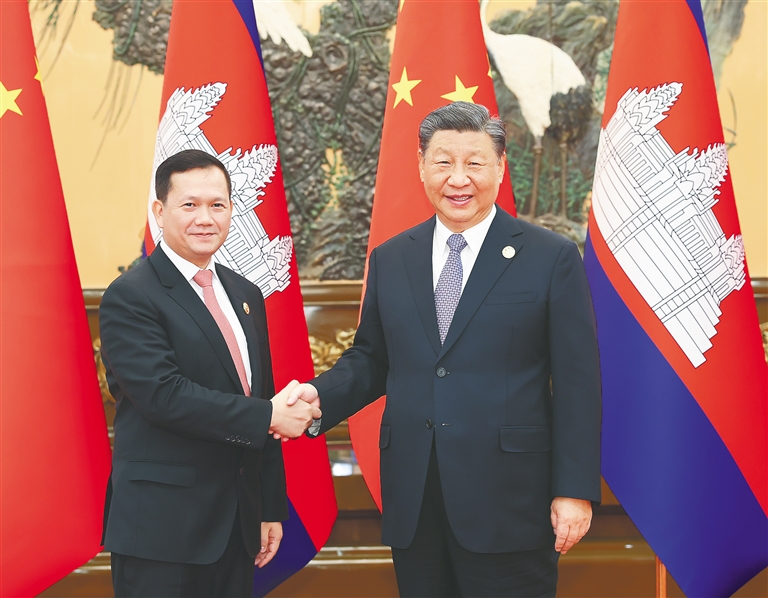 | 10月19日上午,国家主席习近平在北京人民大会堂会见来华出席第三届“一带一路”国际合作高峰论坛的柬埔寨首相洪玛奈。