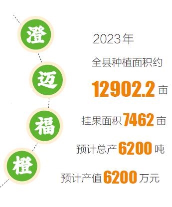 2023年,澄迈福橙种植面积约12902.2亩,挂果面积7462亩,预计总产6200吨,预计产值6200万元。