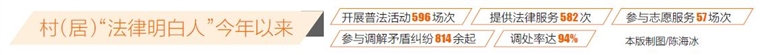 今年以来,澄迈县村(居)“法律明白人”共开展普法活动596场次,提供法律服务582次,参与志愿服务57场次,参与调解矛盾纠纷814余起,调处率达94%。