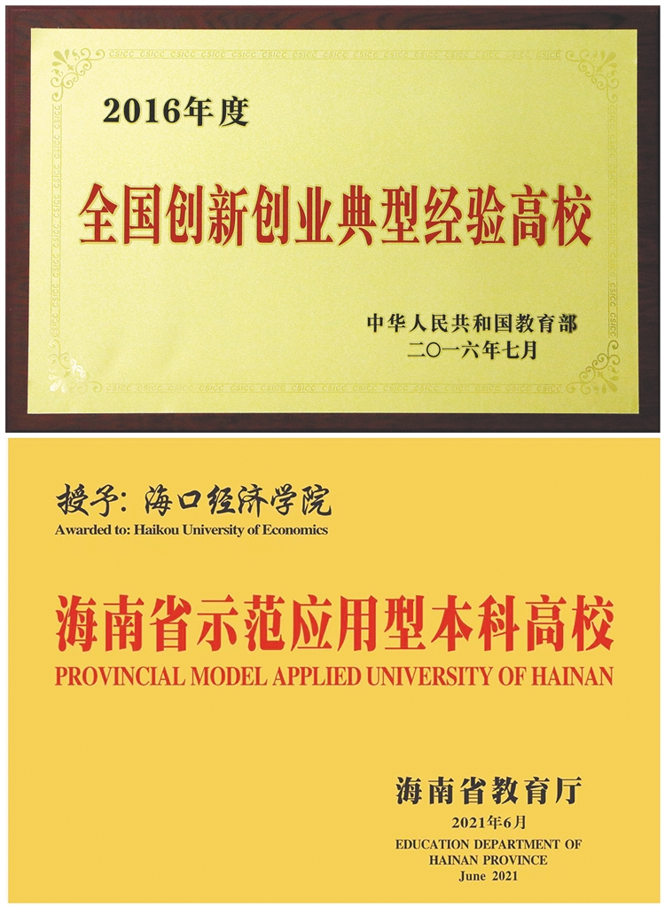 在各类学科专业竞赛中,获得国家及以上奖项236项、省级奖项612项,其中一等奖156项;在全国“互联网+”大学生创新创业大赛中,获得国家级奖项30余项、省级奖项70余项;涌现出了一大批学生先进典型,包括:全国大学生自强之星标兵2人、全国大学生自强之星24人、全国优秀共青团员4人、中国青年志愿者优秀个人奖1人、海南青年五四奖章获得者6人、海南省道德模范3人;学校获评:全国先进社会组织、全国创新创业典型经验高校(首批)、全国大学生创业示范园、海南省深化创新创业教育改革示范高校、全省文明校园、“全国民办高校学生工作创新成果奖”一等奖、全国大学生艺术展演一等奖、“三下乡”全国社会实践优秀品牌项目等。最为耀眼的是,2021年,学校通过海南省教育主管部门评审验收,并经国家教育部同意,被正式确立为“海南省示范应用型本科高校”(全省首家),为推进地方本科高校向应用型转变和海南国际教育创新岛建设与发展做出了样本与示范。学校的典型经验与特色做法曾多次被国内诸多主流媒体深度报道、广为传颂。