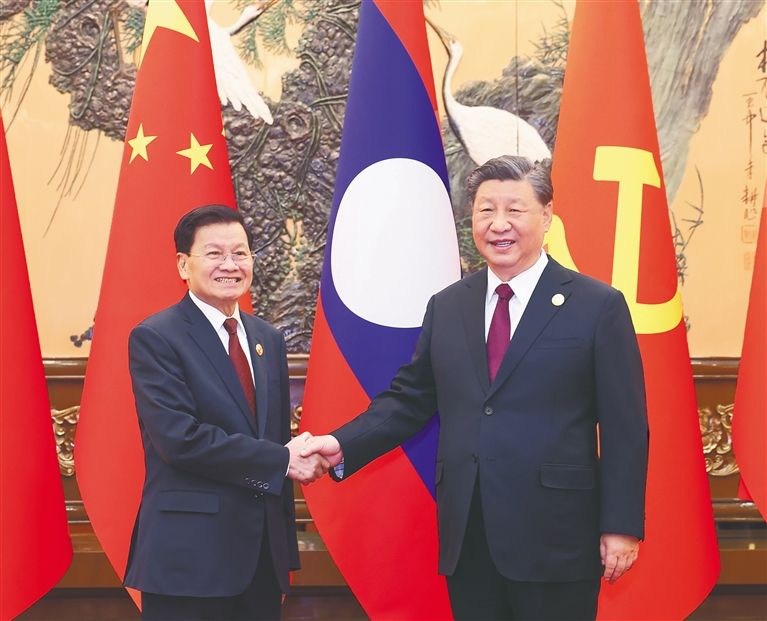新华社北京10月20日电(记者温馨 张骁)10月20日上午,中共中央总书记、国家主席习近平在人民大会堂会见来华出席第三届“一带一路”国际合作高峰论坛并进行工作访问的老挝人民革命党中央总书记、国家主席通伦。